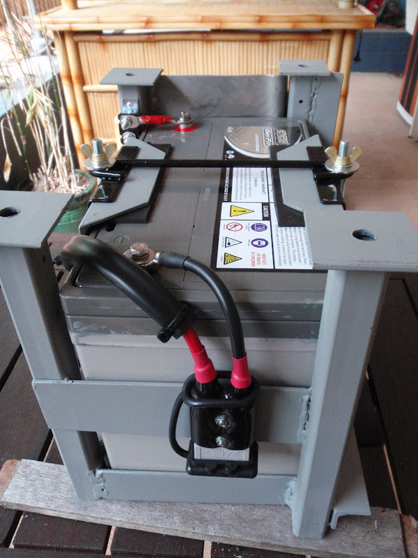 Friday evening we finished off the cradle, installed the battery for the last time, and bolted it all together. That then left me in a position to get it all wired up. The circuit breaker ended up in the perfect position just off the +ve terminal, and it was quite a straight-forward job. It's now it's own self-contained unit, able to be connected to the rest of the car via the Anderson plug on the rear.